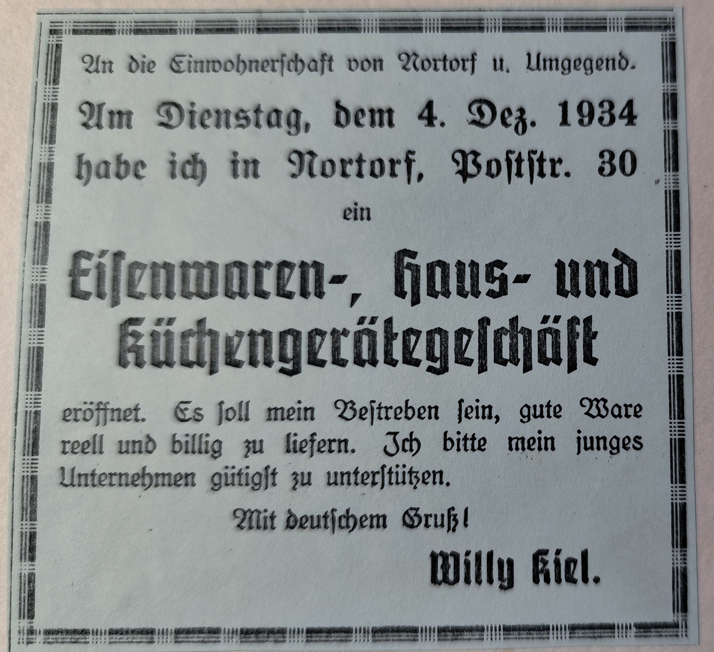 Willy Kiel wurde 1908 in Bordesholm als Sohn des Kaufmanns Hinrich Kiel geboren. 1934 kaufte er das Geschäftshaus in der Itzehoer Str. 2 in Nortorf,